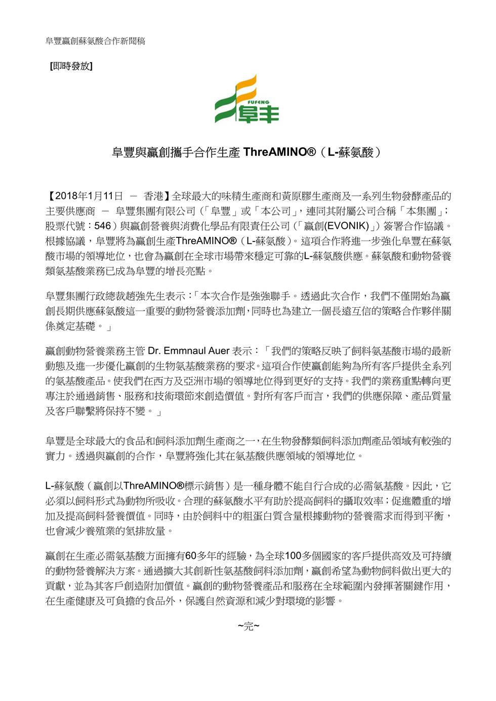 星空体育·星空网站登录官网入口-星空(中国)与赢创携手合作生产ThreAMINO®(L-苏氨酸)
